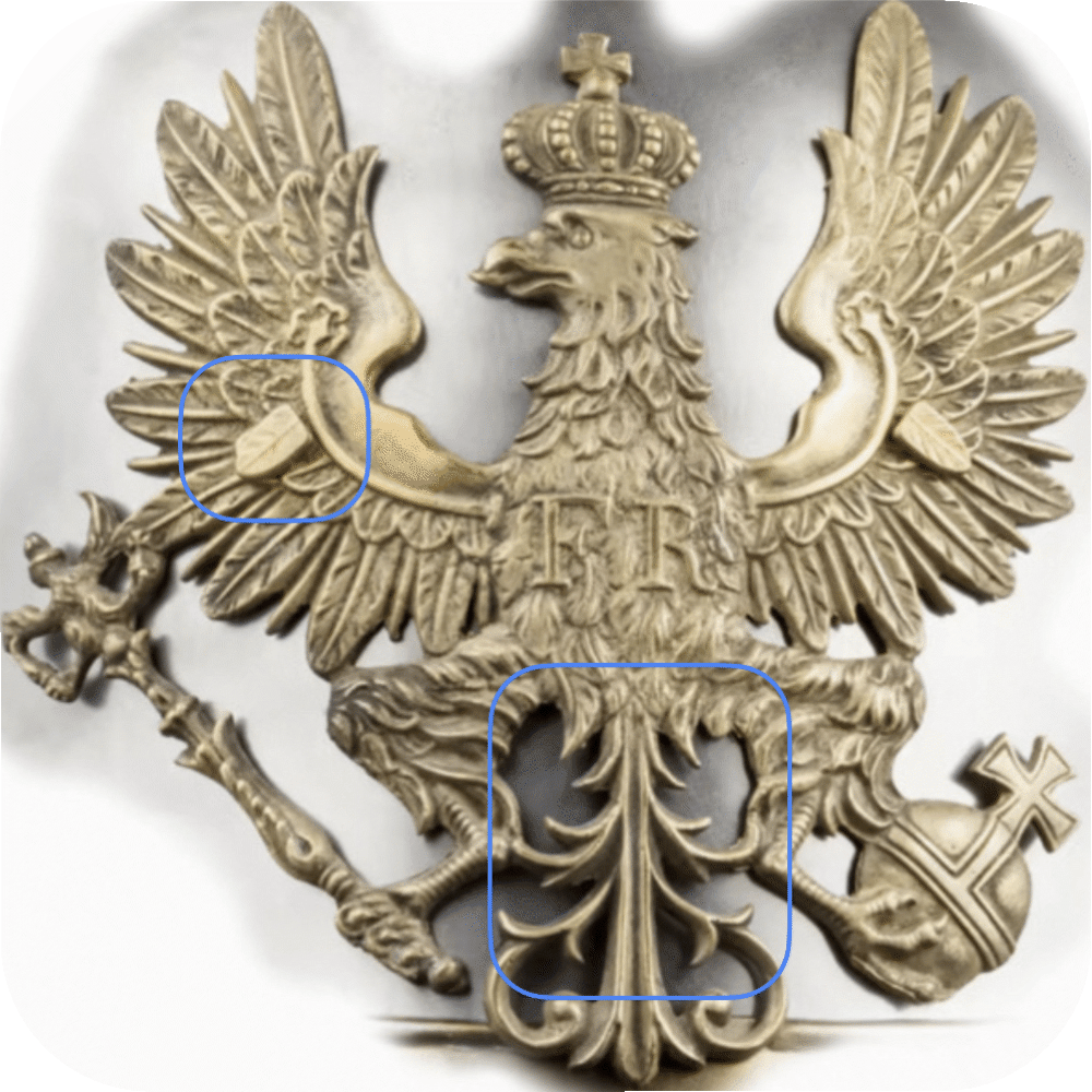 - Are there indications if a helmet eagle was cast (e.g. small bubbles)?