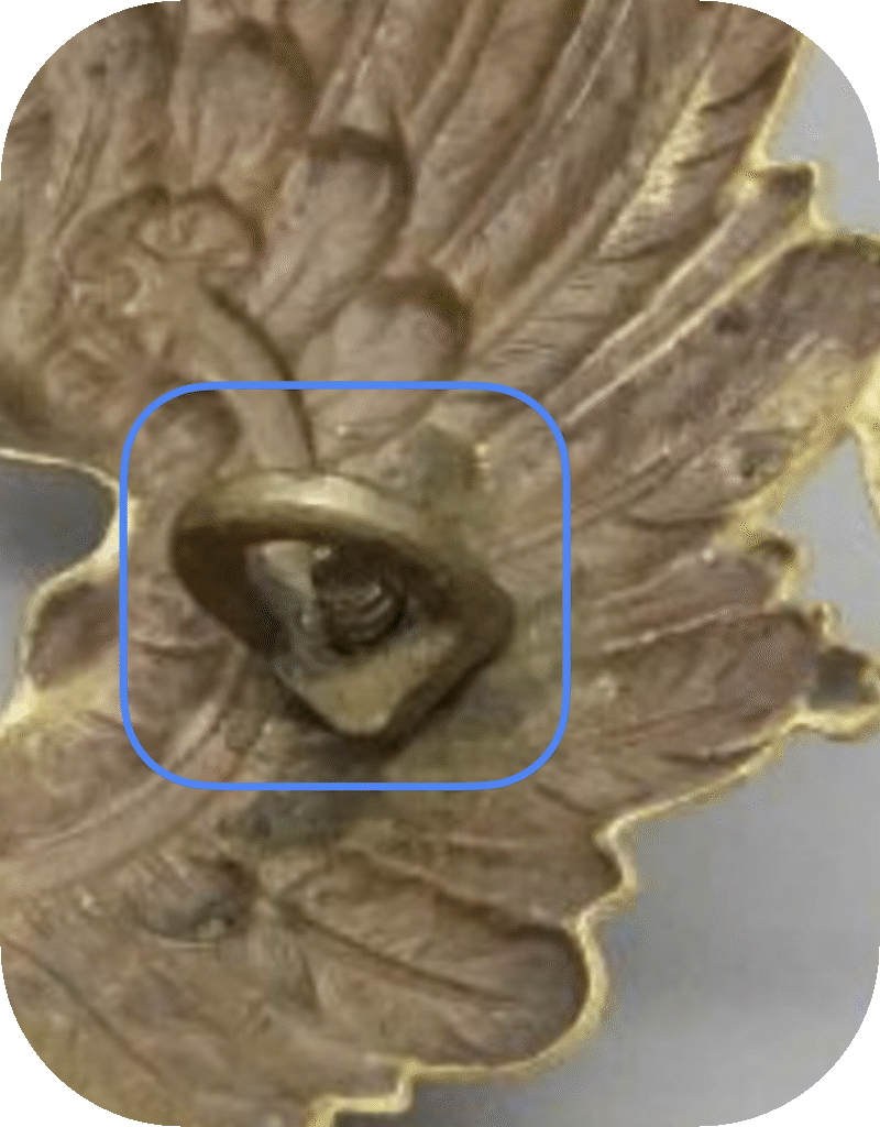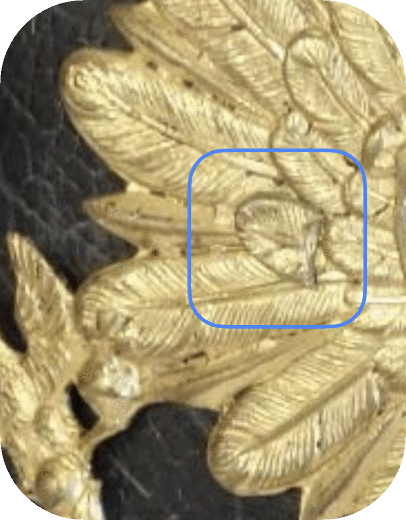 To attach them to the helmet, either threaded bolts with a stealth head were inserted through 2 holes drilled for this purpose in the wings (Figs. 1+3) and screwed to the helmet with rectangular bow nuts, or 2 threaded pins were soldered to the back and also screwed with rectangular bow nuts (Fig. 4). The stealth heads of the pass-through bolts were often shaped to fit the missing feather pattern caused by the hole in the helmet eagle, which was sometimes more and sometimes less successful (cf. Figs. 1+3). However, some stealth heads are real works of art, which always show me how proud the craftsmen of that time were of their work