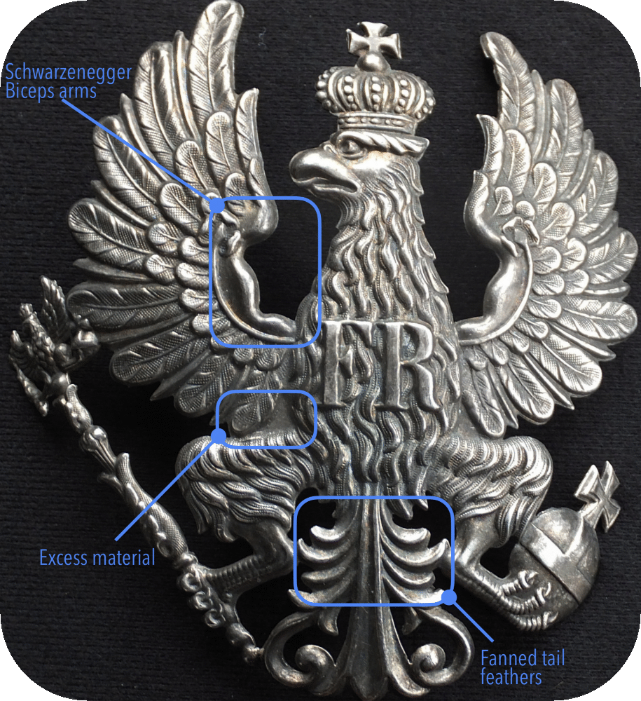 Since the manufacturers of that time were not yet able to cut free small spaces without much effort, there was still some excess material left between the wings and thighs of the helmet eagles after molding. Reworking would have been possible without a doubt, but the effort wouldn't have been insignificant and the costs thus too high. Since it was not very noticeable, the economical Prussians decided to leave the excess material as it was. The one shown in Fig. 2 is the most common helmet eagle for both enlisted men's and officers' helmets. There are other variants of the helmet eagle M1842/43, with larger deviations at the tail feathers, but these were, as far as I could find out, exclusively Landwehr eagles. Therefore, I suspect that they were all helmet eagles of property helmets.