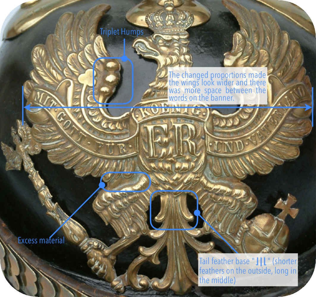 Characteristics of Prussian lines helmet eagle of the various models of pickelhauben