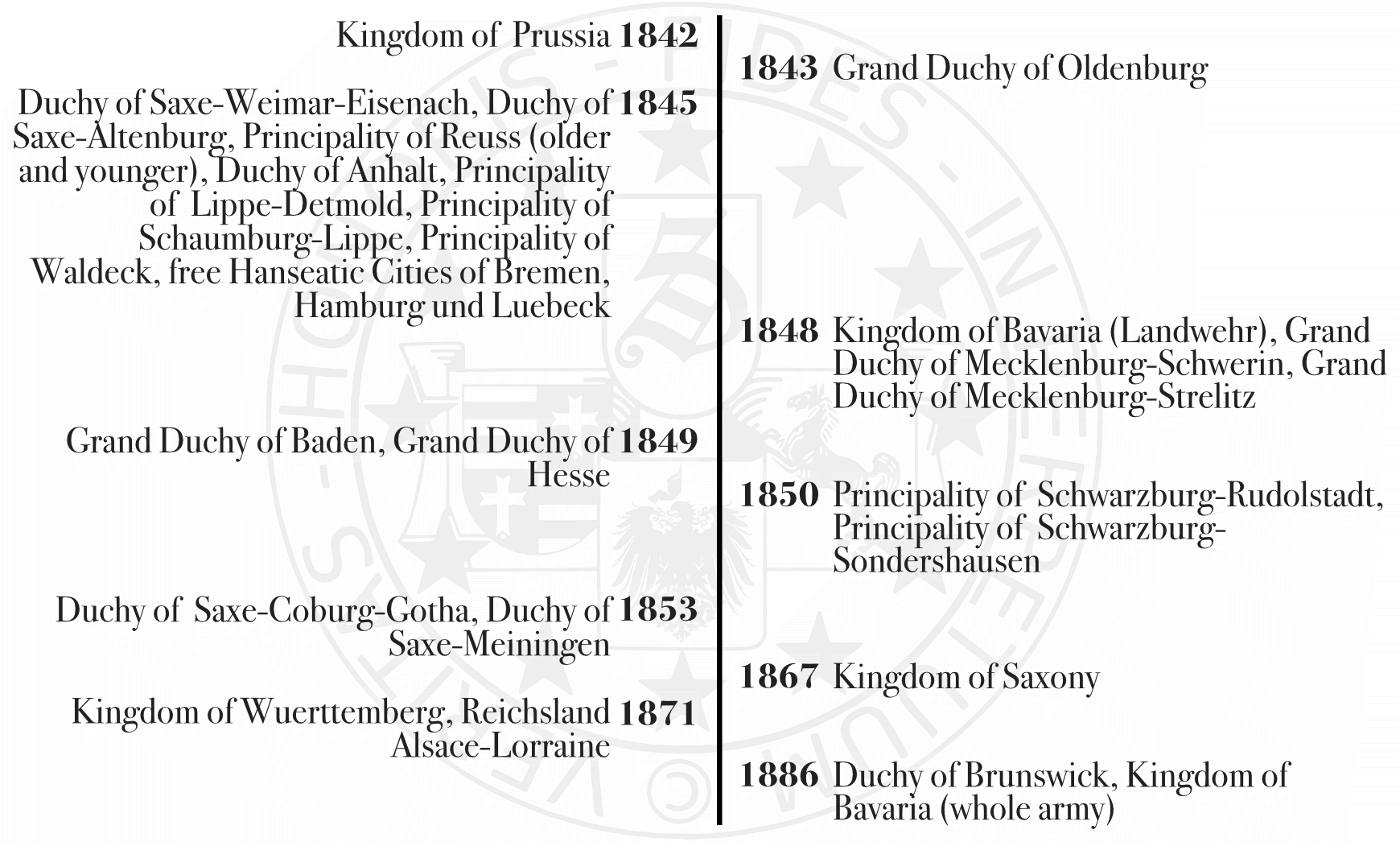 The new types of helmets (Pickelhauben) with cockades in the colors of the individual countries, but mostly in the Prussian style, were introduced into the armies of the German states as follows: