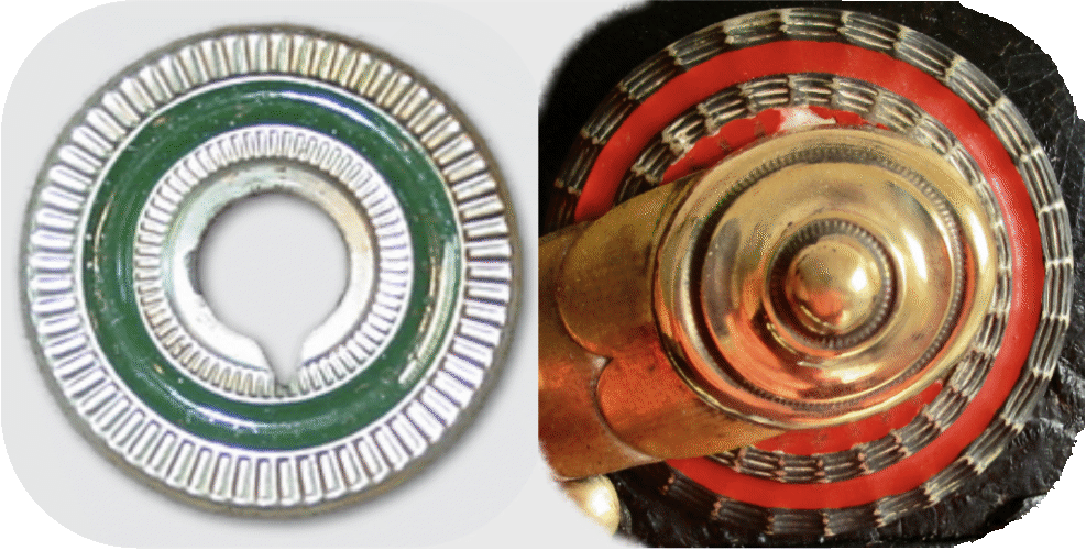 - Officers: The officers also received a lower helmet M/67 on 2.5.67. For them, however, a completely new cockade model was introduced, which differed in size and design from the enlisted men's cockade. The "double ring" or "twin ring" cockade had a diameter of 55 mm and a newly designed silver-plated slip-on ring of 5 mm width. This consisted of 2 interconnected rings 2.5 mm wide, with slightly raised thin borders (the inner border was sometimes just dotted). The area between the raised edges was usually embossed with a decorative fishbone pattern (Fig. 9 right). Varying designs, however, suggest some design latitude on the part of the manufacturers. According to the regulations, an approx. 8 mm wide ring should still be visible from the outer serrated edge of the cockade.