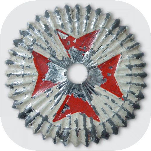 Enlisted men: The cockade was now a metal disc pressed into folds, still with a diameter of 70 - 75 mm and a ring painted on in color (Fig. 6). In the center it had a mounting hole of about 8 - 9 mm for attachment under the chinscale. The material was mostly iron sheet. In Baden, however, brass sheet was preferred because it did not have to be painted and only a red ring had to be painted on.