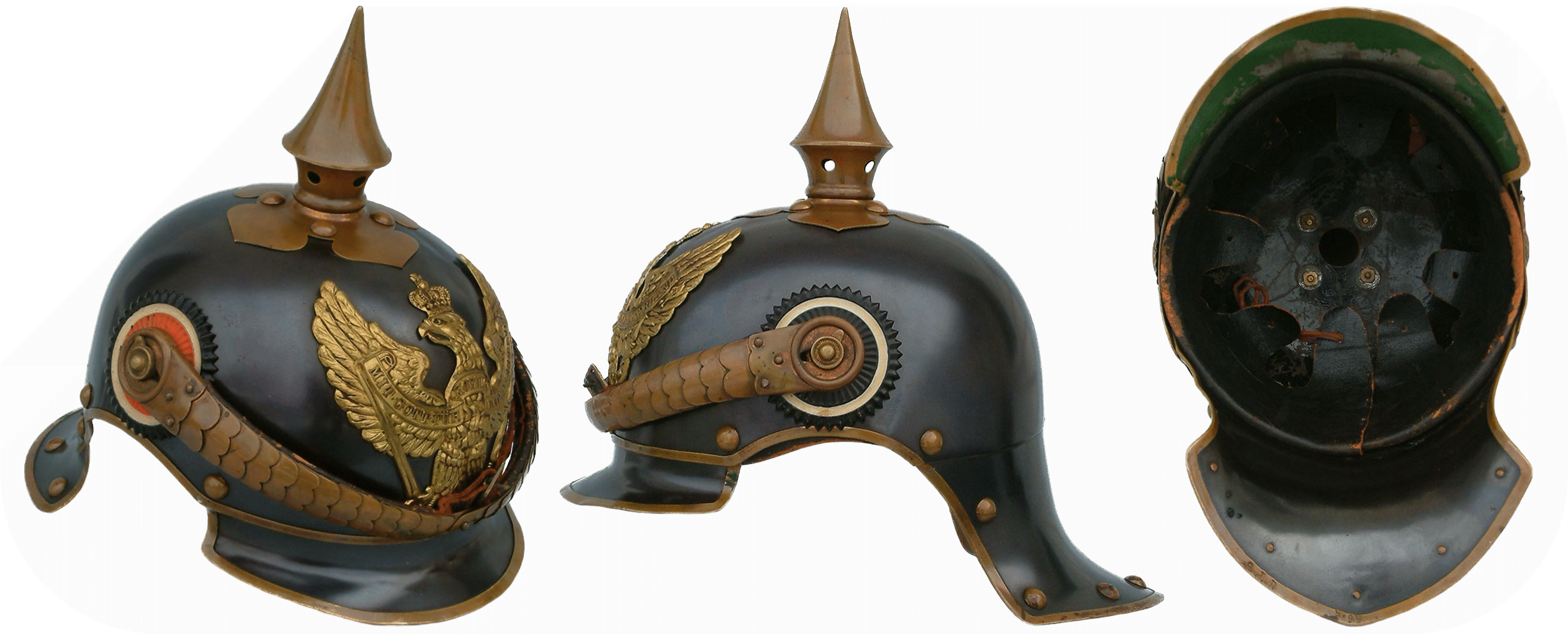 - Der Helmkörper war geformt wie die Helme der Kürassier-Offiziere und bestand aus geschwärztem und poliertem Stahlblech, die Innenflächen glich wieder den Offiziershelmen der Kürassiere.