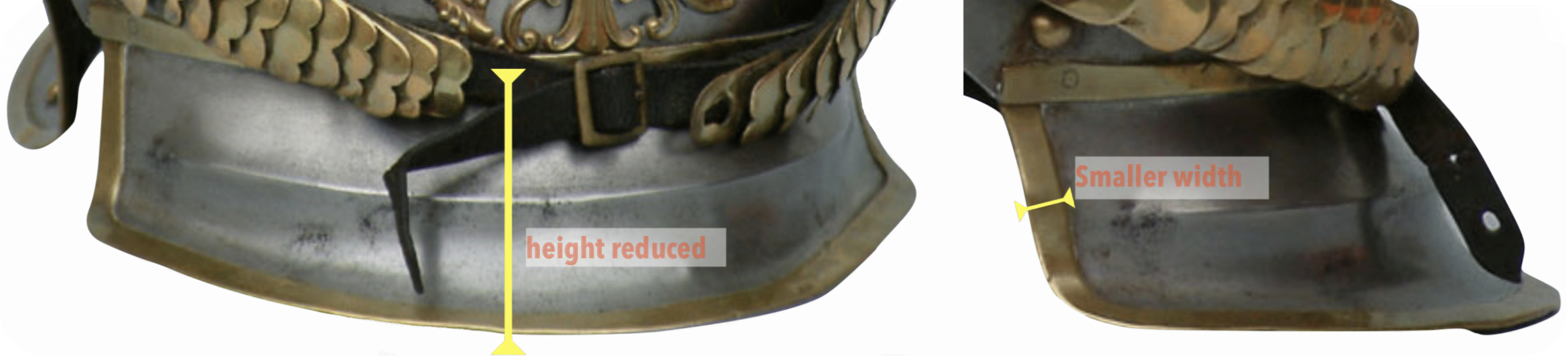 Since the load for the horses of the cuirassiers seemed too high, great efforts were made in the middle of the 19th century to reduce the weight of the cuirassier equipment. In this context, the cuirassier helmet was also changed, so that on 7.10.1862 a new type M1862 was introduced for enlisted men and officers: