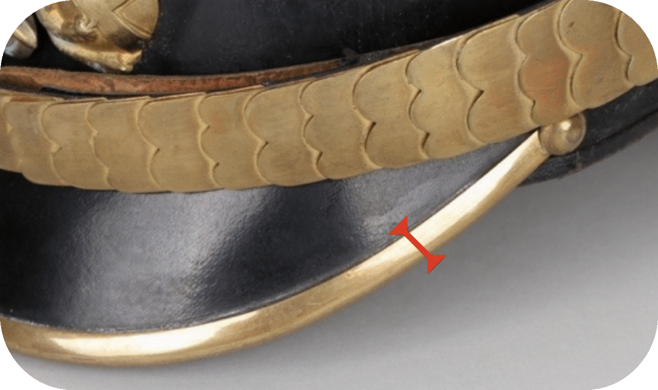 - The helmet visors of the officer's helmets had slightly different dimensions than those of the enlisted men's helmets, but they are more easily recognized by the fact that they were colored on the underside. The back visor was covered with red linen, the front visor with green linen (Fig. 10). The undersides of the enlisted men's helmets always showed bare leather (from this one can sometimes recognize made-up officer's helmets or property helmets of one-year volunteers, which had almost all the other characteristics of an officer's pickelhaube in some cases).