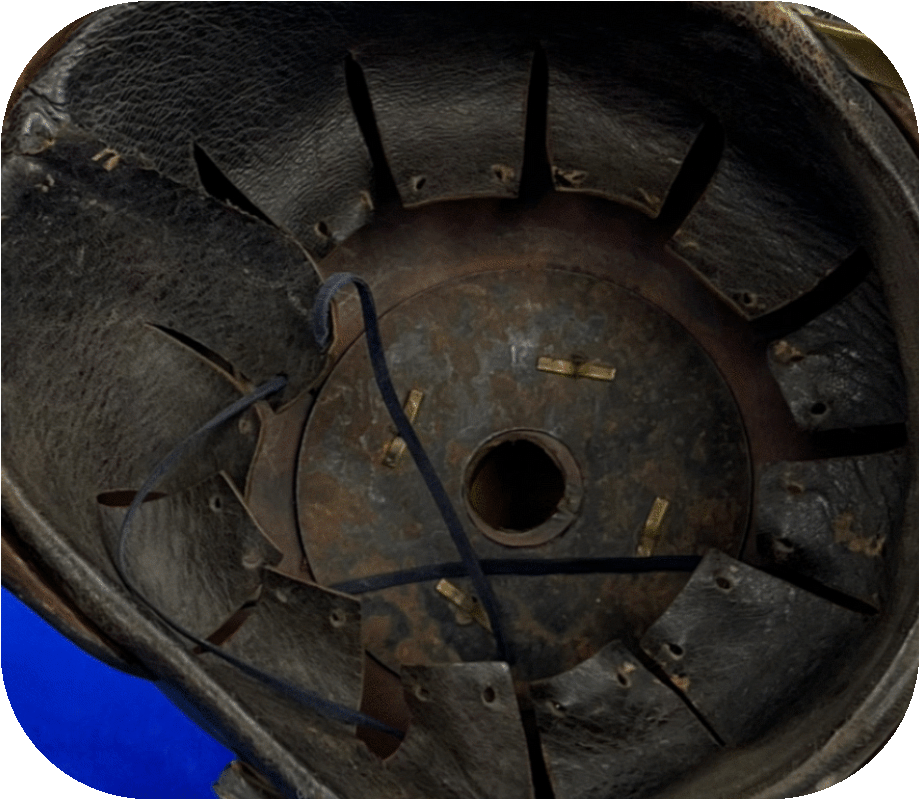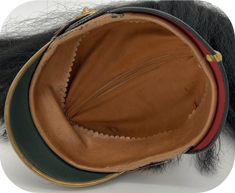 - The liner inside the helmet consisted of a very fine sweatband of goatskin, about 6 cm wide, and was lined in the middle with a freely chosen fabric (often silk) (Fig. 10). Enlisted men's helmets had only a lining with 9 tongues of thicker sheepskin or goatskin (Fig. 11). Until about 1880, officer's helmets also had a leather lining with tongues, but this was finer, there were more tongues and, in contrast to the enlisted men's helmets, these were cut straight (cf. Figs. 12 and 11).