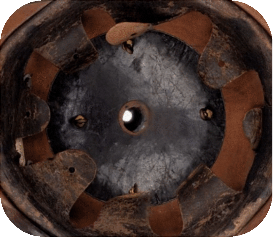 - Back spine often with 2 half-round head screws/splints visible from the outside (like old Prussian dragoon helmets)