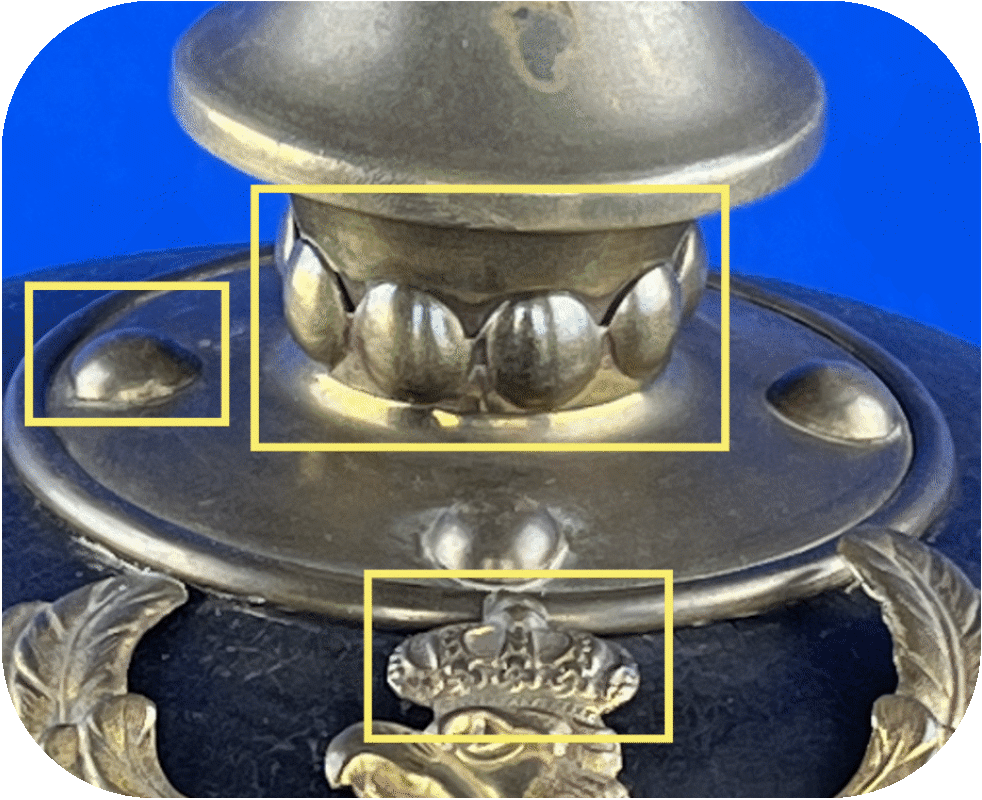 - The spikebase for attaching the spike to the leather body was attached to the helmet with star-headed set of screws/split-pins instead of half-round-headed ones (cf. Figs. 1 and 2).