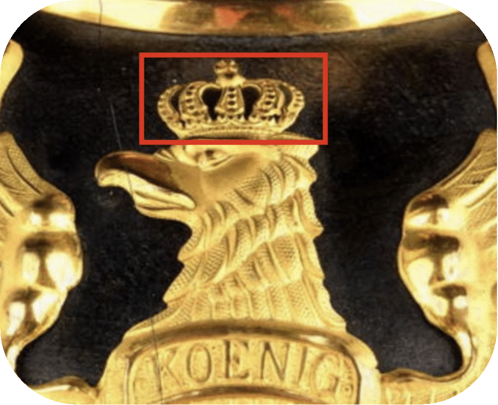 - The plates on the pickelhauben were more detailed and the spaces between the individual brackets of the crowns were always voided, whereas these free spaces were only indicated on enlisted men's helmets (cf. Figs. 7 and 2). The officer's plates were always fastened with threaded pins and square nuts soldered to the back. Over the years, various fastening methods were used for enlisted men's helmets.