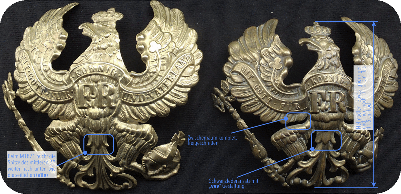 Für den Helmadler M1871 wechselte man wieder auf die bewährte Gewinde/Mutter-Befestigung zurück, da die Helmadler-Halterung vom M1867 wie erwähnt leider nicht praxistauglich war. Anstelle der Vierkant-Bügelmuttern wurden nun aber durchgehend einfache Vierkantmuttern aus Messing verwendet. Und obwohl der Helm M1871 wieder etwas niedriger als das Vorgängermodell war blieben die Abmaße des Helmadlers diesmal unverändert. Die Gestaltung des Helmadlers M1871 unterschied sich jedoch in einigen Punkten vom Vorgängermodell.