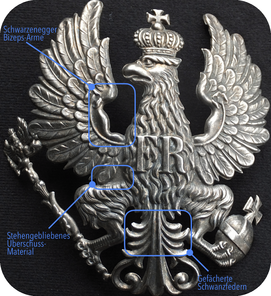 Da die Hersteller damals noch nicht in der Lage waren kleine Zwischenräume ohne viel Aufwand freizuschneiden, blieb nach dem Pressen zwischen den Flügeln und Oberschenkeln der Helmadler immer noch einiges an überschüssigem Material stehen. Eine Nacharbeit wäre zweifelsfrei möglich gewesen, doch der Aufwand wäre nicht unerheblich und die Kosten damit zu hoch. Da es zudem nicht groß auffiel verzichteten die sparsamen Preussen auf diesen Arbeitsschritt und ließen das Überschuss-Material stehen. Der auf Bild 2 gezeigte ist der verbreitetste Helmadler für Mannschafts- und Offiziershelme. Es gibt noch weitere Varianten des Helmadlers M1842/43, mit größeren Abweichungen am Schwanzfederansatz, aber dieses waren, soweit ich das in Erfahrung bringen konnte, ausschließlich Landwehradler. Daher vermute ich das es alles nur Helmadler von Eigentumshelmen waren.