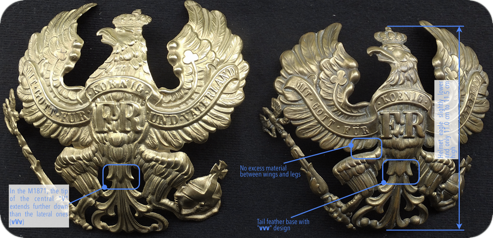The M1860 helmet eagle ( Fig. 8) was slightly lower than the M1842/43/57, measuring 12.0 cm to 12.5 cm in height, but the width remained the same. Due to the changed proportions, the wings appeared somewhat wider and the banner "Mit Gott, für König und Vaterland" (With God, for King and Fatherland), which had also become somewhat smaller, could be positioned more pleasingly as a result, with larger spaces between words. Furthermore, the bumps on the upper ridge of the wings, which looked like well-toned biceps muscles, were compressed into triplet bumps, giving the wings a more elegant look overall.