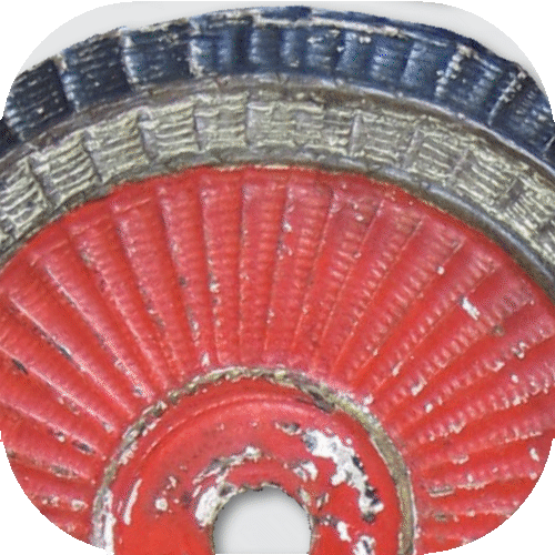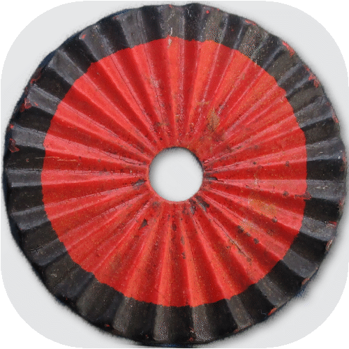 Enlisted men: The cockade was now a metal disc pressed into folds, still with a diameter of 70 - 75 mm and a ring painted on in color (Fig. 6). In the center it had a mounting hole of about 8 - 9 mm for attachment under the chinscale. The material was mostly iron sheet. In Baden, however, brass sheet was preferred because it did not have to be painted and only a red ring had to be painted on.