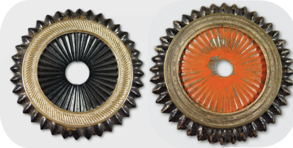 - Officers: The officers also received a lower helmet M/67 on 2.5.67. For them, however, a completely new cockade model was introduced, which differed in size and design from the enlisted men's cockade. The "double ring" or "twin ring" cockade had a diameter of 55 mm and a newly designed silver-plated slip-on ring of 5 mm width. This consisted of 2 interconnected rings 2.5 mm wide, with slightly raised thin borders (the inner border was sometimes just dotted). The area between the raised edges was usually embossed with a decorative fishbone pattern (Fig. 9 right). Varying designs, however, suggest some design latitude on the part of the manufacturers. According to the regulations, an approx. 8 mm wide ring should still be visible from the outer serrated edge of the cockade.