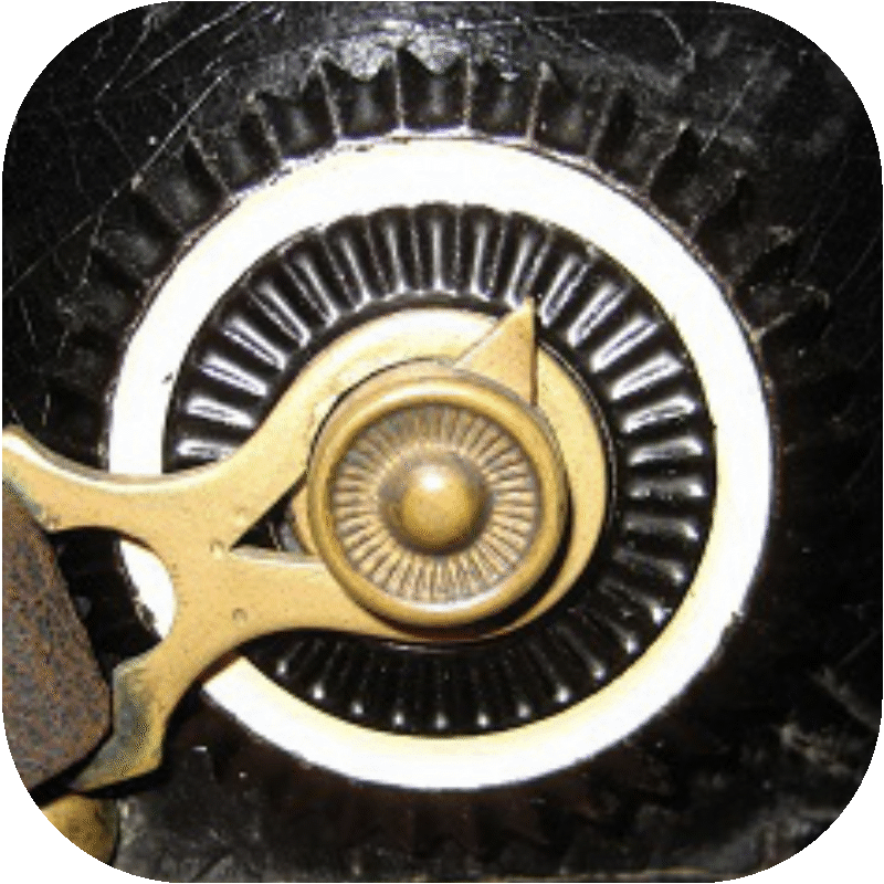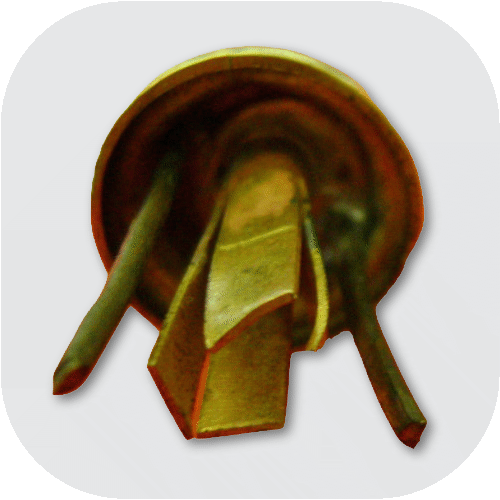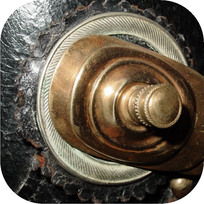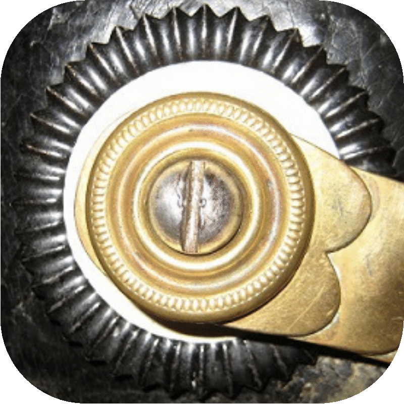 - Enlisted men: Since the hook fastening was found to be impractical, a new chinstrap fastening was introduced for the enlisted men in 1891. The M/91 chinstrap fastener consisted of a small cylindrical knob with a backward directed arrow on it (Fig. 12). Through this, the metal loop of the chinstrap, which was provided with a matching notch, could not be lost, because the chinstrap could only be removed facing backwards. For the new fastening, the mounting hole of the cockades was enlarged up to 14 - 15 mm, but the outer diameter in 1891 was still 50 mm (Fig. 13).