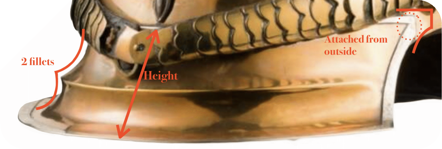 - The rear visor consisted of 3 sheets (Fig. 2). These were first assembled and the edges were then also framed with a metal trim. The inside of the visor remained unfinished, since it was later covered with black leather and the edges of the leather were to be covered with the metal trim. After completion, the rear visor was then riveted to the helmet shell from the inside. So that it remained somewhat movable it was fastened only at the two sides, to it. The mobility should, so it was believed at least, protect the rider in case of falls from the horse.