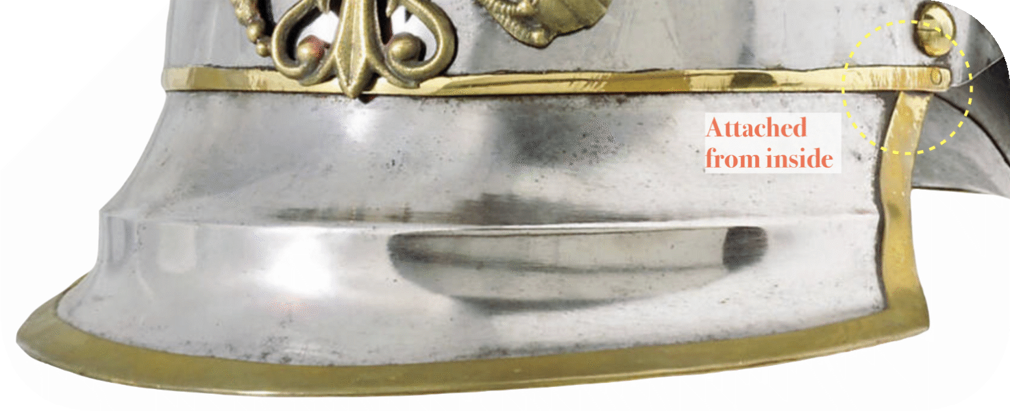 - In the time of use, a serious disadvantage of the externally riveted front visor became evident on the M1843. In the event of rain, water dripped into the wearer's face through a gap between the visor and the helmet shell, which is why the visor was riveted on from the inside when new helmets were purchased (Fig. 1). This eliminated the previous trim on the upper edge of the front visor and the visor measured only 7.2 - 7.3 cm in height and 21.0 - 21.6 cm in width. A related AKO is unfortunately not known, but this helmet type is known as M1853 and the changes affected enlisted men and the officer helmets.